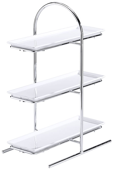 Verchromte Metall-Etagere mit Porzellan-Platten, für Präsentationen am Tisch und Buffet