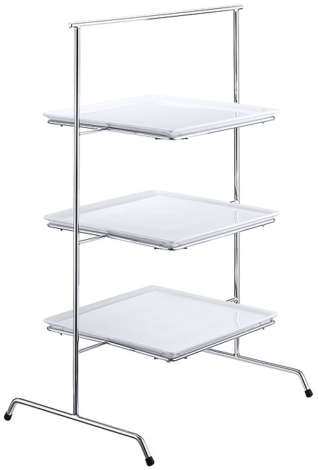 Dreistufige Metall-Etagere, verchromt mit Porzellan-Platten